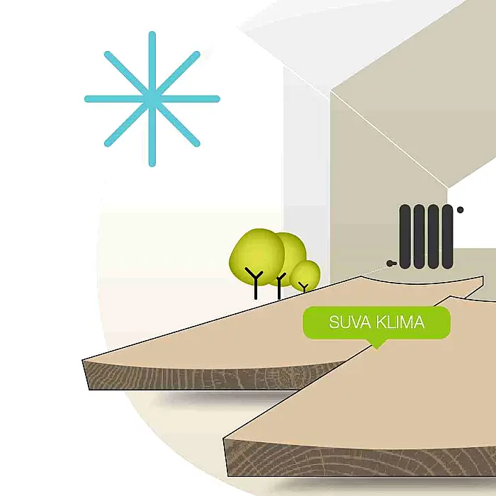 Višeslojna struktura sa bazom od breze smanjuje ove pokrete za 70% u poređenju sa masivnim parketom. To je razlog zašto se jedino takav parket preporučuje za prostore sa velikim staklenim površinama ili podnim grejanjem.