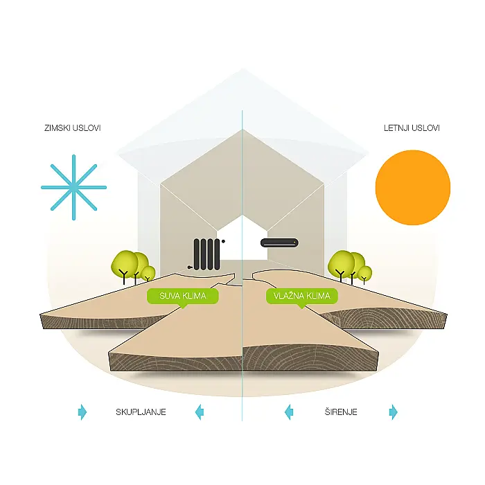 Problem nestabilnosti: Drvo se širi po širini vlakana. Kod daske masiva širine 140mm, sezonske promene vlage mogu dovesti do pojave fuga od po nekoliko milimetara.